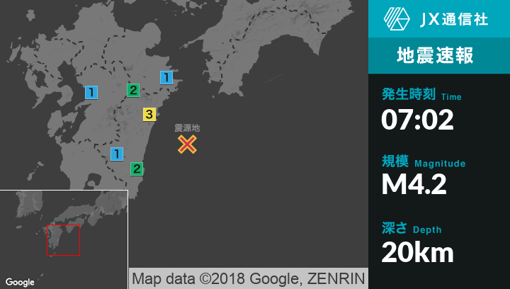 | 震度1 | 延岡市, 日向市, 新富町, 木城町, 宮崎都農町, 椎葉村, 高千穂町, 日之影町, 宮崎市, 綾町, 小林市, 熊本美里町, 佐伯市 |