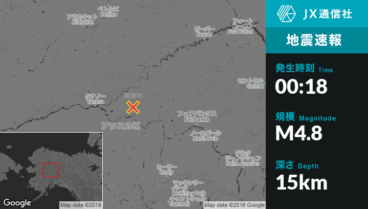 8月29日 00:18頃、アラスカのManley Hot Springsから北北東22kmの地点でM4.8の地震がありました。