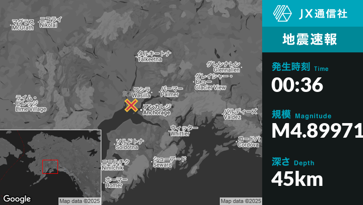 | 震源地 | アラスカのPoint MacKenzieから西19kmの地点 |