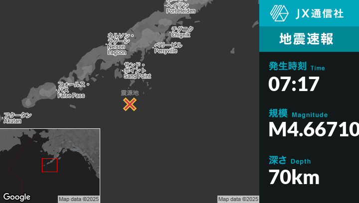 | 震源地 | アラスカのSand Pointから南南東89kmの地点 |