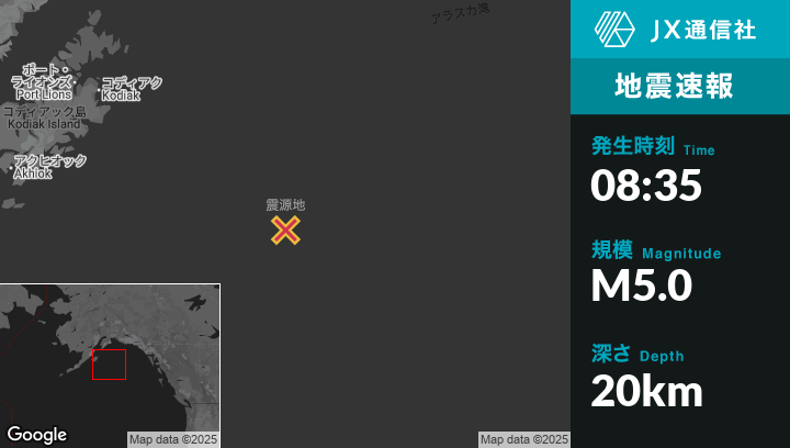 12月17日 08:35頃、アラスカのChiniakから南東262kmの地点でM5.0の地震がありました。