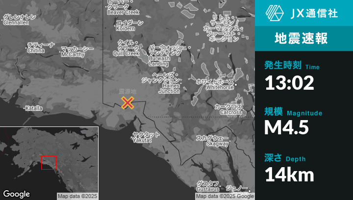 12月21日 13:02頃、アラスカのYakutatから北93kmの地点でM4.5の地震がありました。