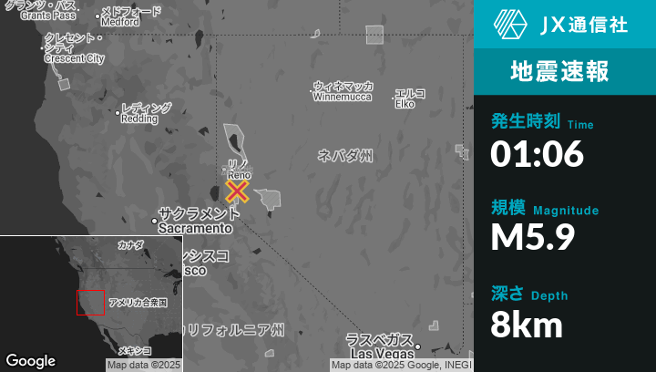12月05日 01:06頃、ネバダ州のDaytonから東6kmの地点でM5.9の地震がありました。