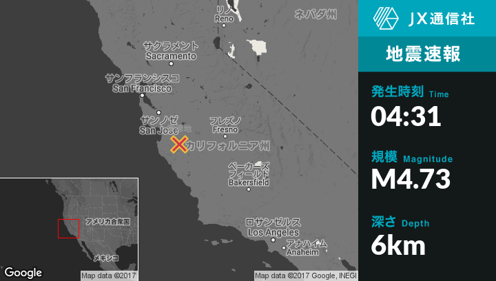 | 震源地 | カリフォルニアのGonzalesから北東22kmの地点 |