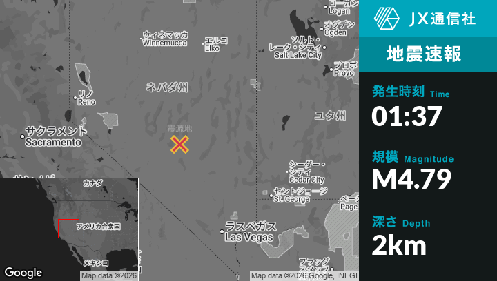3月02日 01:37頃、ネバダ州のTonopahから北東78kmの地点でM4.79の地震がありました。