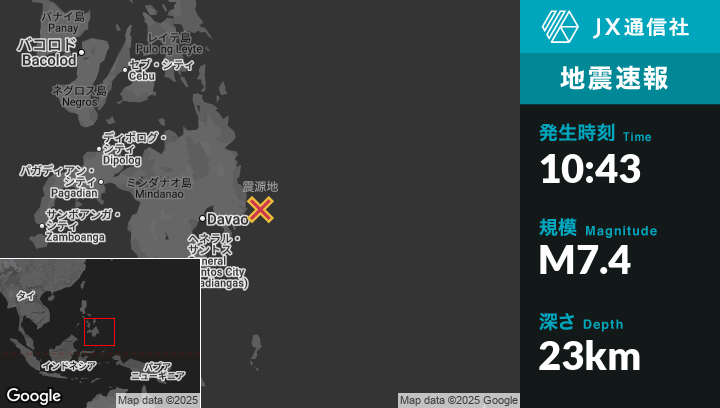 10月10日 10:43頃、フィリピンのBaculinから東南東33kmの地点でM7.4の地震がありました。