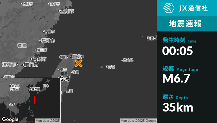 12月28日 00:05頃、台湾のYilanから東35kmの地点でM6.7の地震がありました。