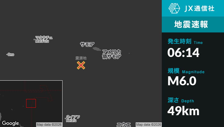 2月11日 06:14頃、サモアのGataivaiから南南西136kmの地点でM6.0の地震がありました。