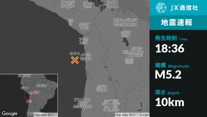 4月30日 18:36頃、チリのIquiqueから西北西91kmの地点でM5.2の地震がありました。