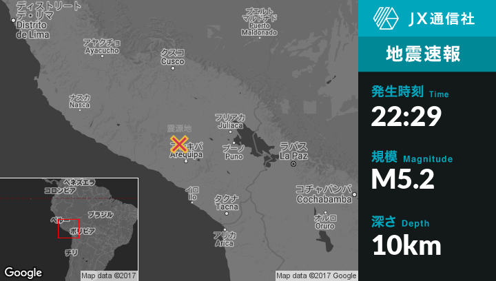 4月30日 22:29頃、ペルーのChivayから南西23kmの地点でM5.2の地震がありました。