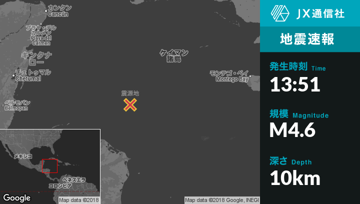 1月10日 13:51頃、ホンジュラスのGreat Swan Islandから東82kmの地点でM4.6の地震がありました。