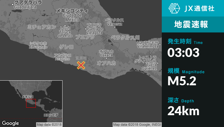 8月23日 03:03頃、メキシコのOmetepecから西北西12kmの地点でM5.2の地震がありました。