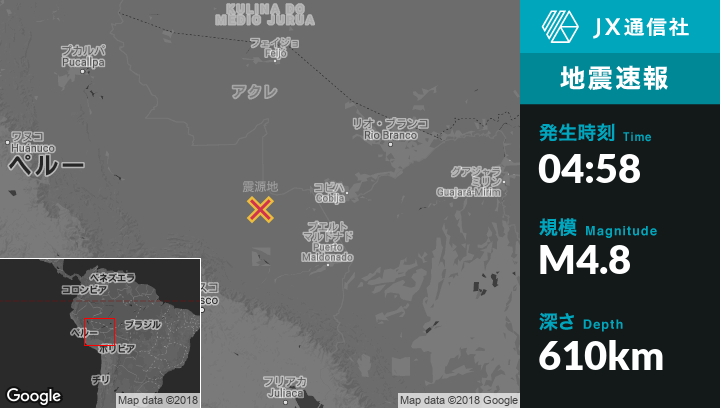 8月27日 04:58頃、ペルーのIberiaから西121kmの地点でM4.8の地震がありました。