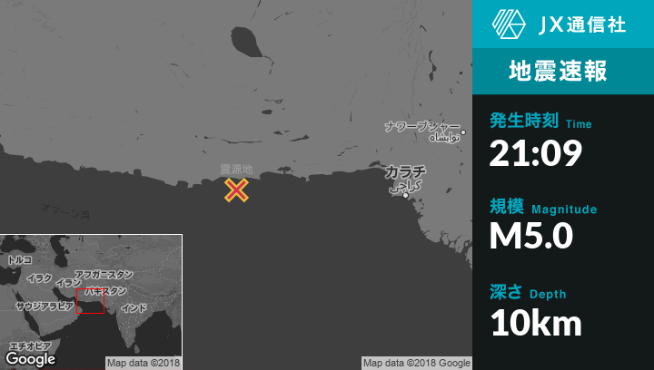 8月27日 21:09頃、パキスタンのPasniから西南西58kmの地点でM5.0の地震がありました。