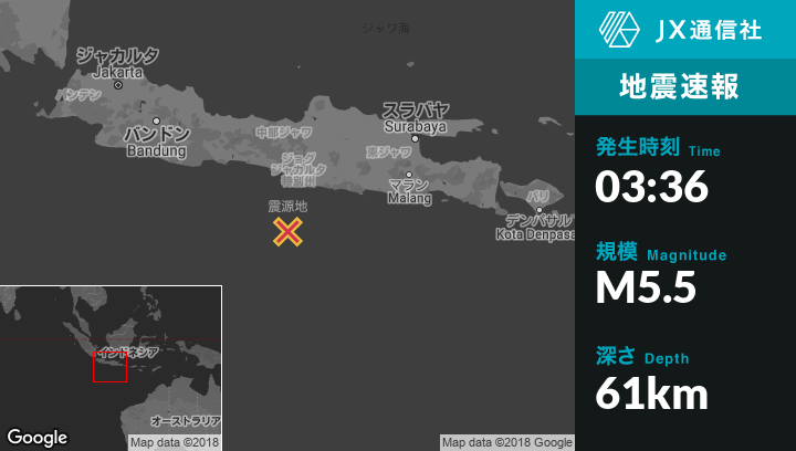 8月29日 03:36頃、インドネシアのBambanglipuroから南112kmの地点でM5.5の地震がありました。
