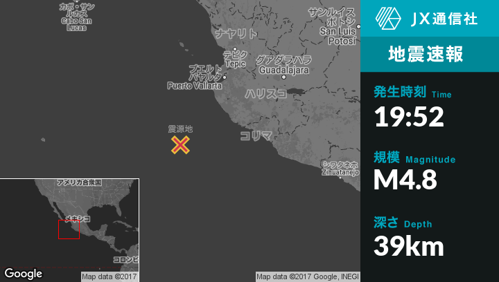 | 震源地 | メキシコのTomatlanから南西195kmの地点 |