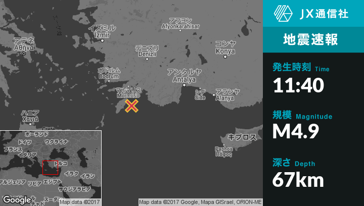 11月07日 11:40頃、ギリシャのFalirakiから東南東20kmの地点でM4.9の地震がありました。