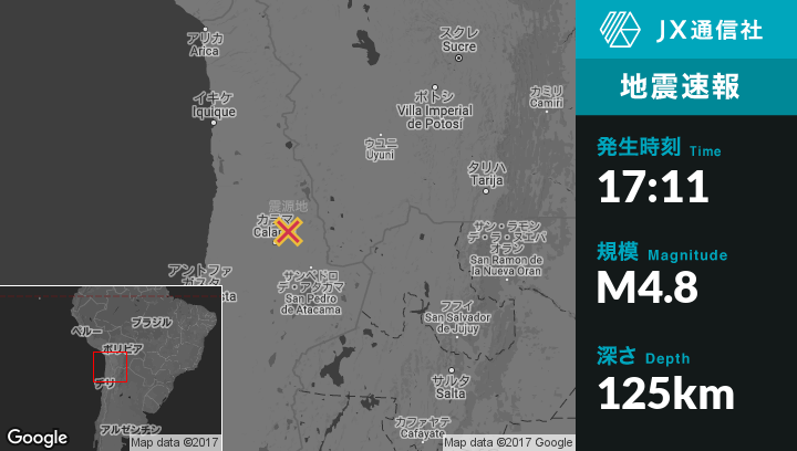 11月07日 17:11頃、チリのCalamaから北東45kmの地点でM4.8の地震がありました。