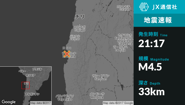 11月07日 21:17頃、チリのLa Serenaから北北西54kmの地点でM4.5の地震がありました。