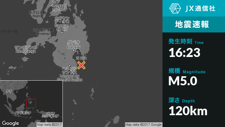 11月08日 16:23頃、フィリピンのSurupから南西21kmの地点でM5.0の地震がありました。