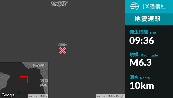 11月11日 09:36頃、セントヘレナのGeorgetownから南423kmの地点でM6.3の地震がありました。