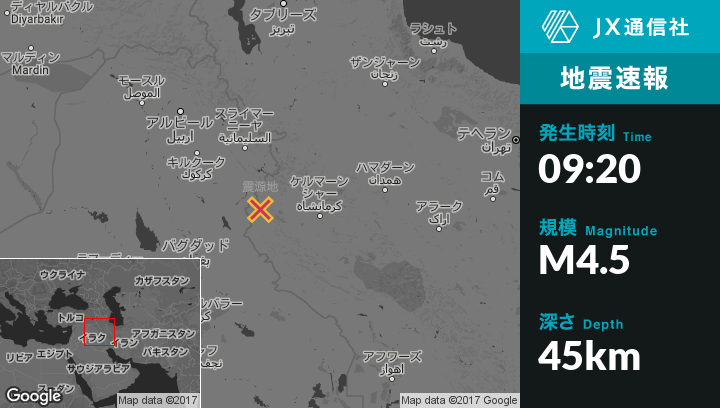 11月13日 09:20頃、イランのSarpol-e Zahabから北西12kmの地点でM4.5の地震がありました。