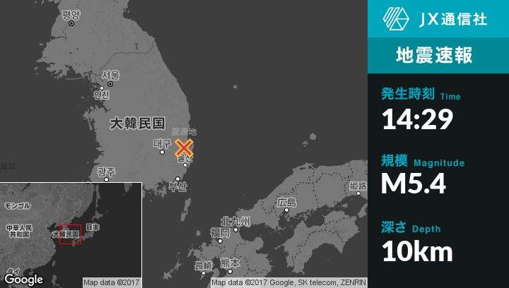 11月15日 14:29頃、韓国のHokoから西北西9kmの地点でM5.4の地震がありました。