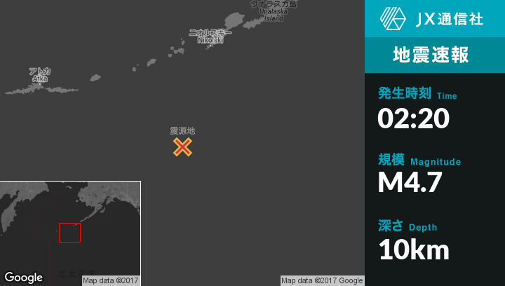 | 震源地 | アラスカのYunaska Islandから南南東188kmの地点 |