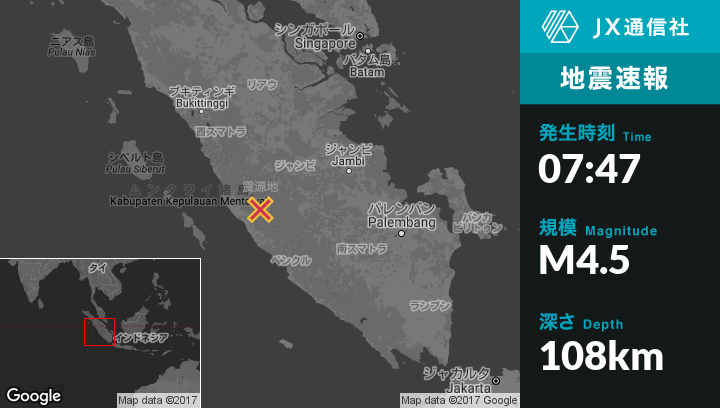 | 震源地 | インドネシアのSungaipenuhから南東41kmの地点 |