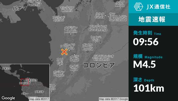 11月16日 09:56頃、コロンビアのArgeliaから北北西9kmの地点でM4.5の地震がありました。