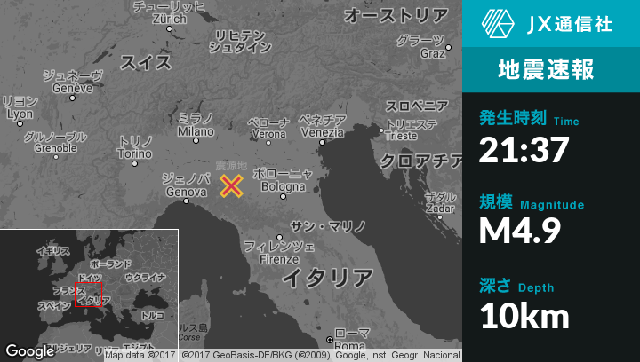 11月19日 21:37頃、イタリアのMedesanoから西5kmの地点でM4.9の地震がありました。