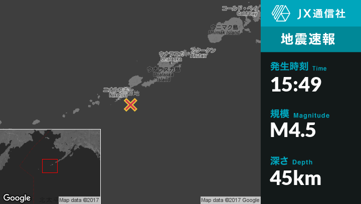 11月22日 15:49頃、アラスカのNikolskiから東南東37kmの地点でM4.5の地震がありました。
