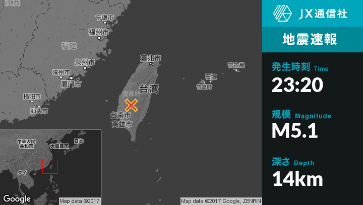 11月22日 23:20頃、台湾のJiayi Shiから東25kmの地点でM5.1の地震がありました。