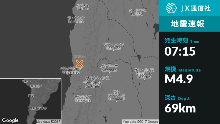 11月27日 07:15頃、チリのLa Liguaから北東32kmの地点でM4.9の地震がありました。