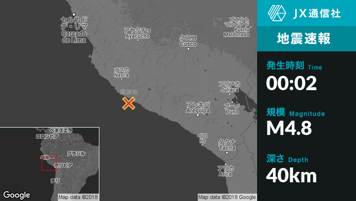 1月17日 00:02頃、ペルーのAcariから南36kmの地点でM4.8の地震がありました。