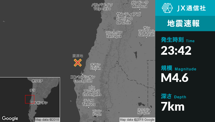 1月21日 23:42頃、チリのTomeから北北西77kmの地点でM4.6の地震がありました。