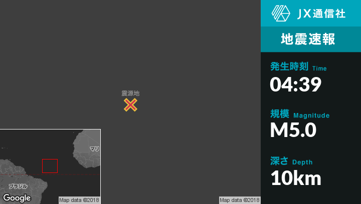 | 震源地 | ブラジルのFernando de Noronha (Distrito Estadual)から北1041kmの地点 |