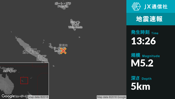 8月31日 13:26頃、ニューカレドニアのTadineから北東61kmの地点でM5.2の地震がありました。