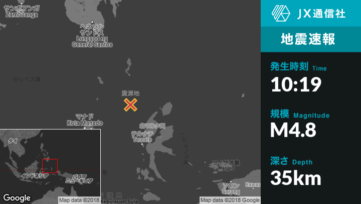 9月02日 10:19頃、インドネシアのTobeloから北西162kmの地点でM4.8の地震がありました。