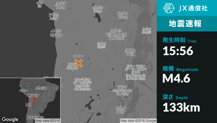 9月02日 15:56頃、チリのCalamaから北北東81kmの地点でM4.6の地震がありました。
