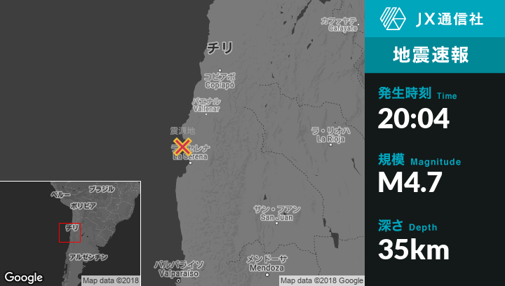 9月02日 20:04頃、チリのLa Serenaから北北西64kmの地点でM4.7の地震がありました。