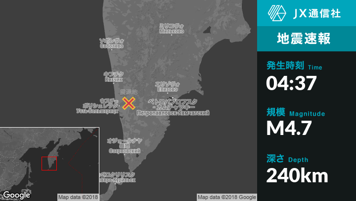 9月04日 04:37頃、ロシアのParatunkaから西101kmの地点でM4.7の地震がありました。