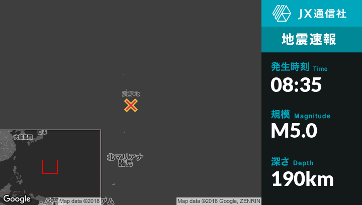 9月04日 08:35頃、北マリアナ諸島のPaganから南南東59kmの地点でM5.0の地震がありました。
