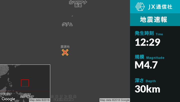 9月06日 12:29頃、グアムのMerizo Villageから南233kmの地点でM4.7の地震がありました。