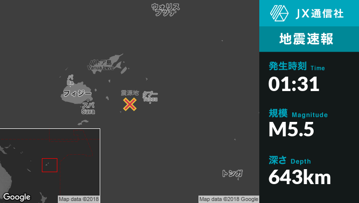 9月07日 01:31頃、フィジーのSuvaから東194kmの地点でM5.5の地震がありました。