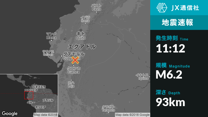 9月07日 11:12頃、エクアドルのAlausiから南南西17kmの地点でM6.2の地震がありました。