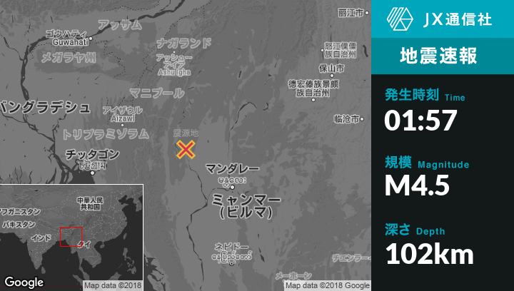 | 震源地 | ミャンマーのMawlaikから南南東59kmの地点 |