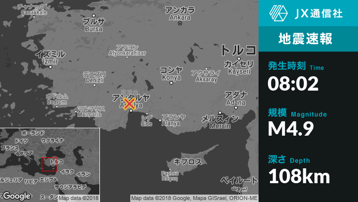 9月11日 08:02頃、トルコのBucakから南25kmの地点でM4.9の地震がありました。