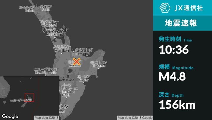 9月18日 10:36頃、ニュージーランドのRotoruaから東南東11kmの地点でM4.8の地震がありました。