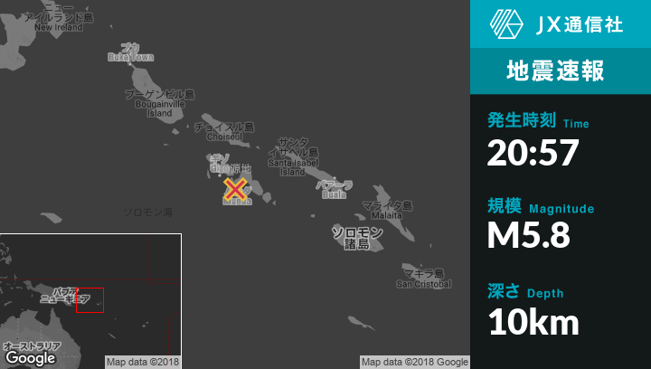 9月18日 20:57頃、ソロモン諸島のGizoから東南東48kmの地点でM5.8の地震がありました。
